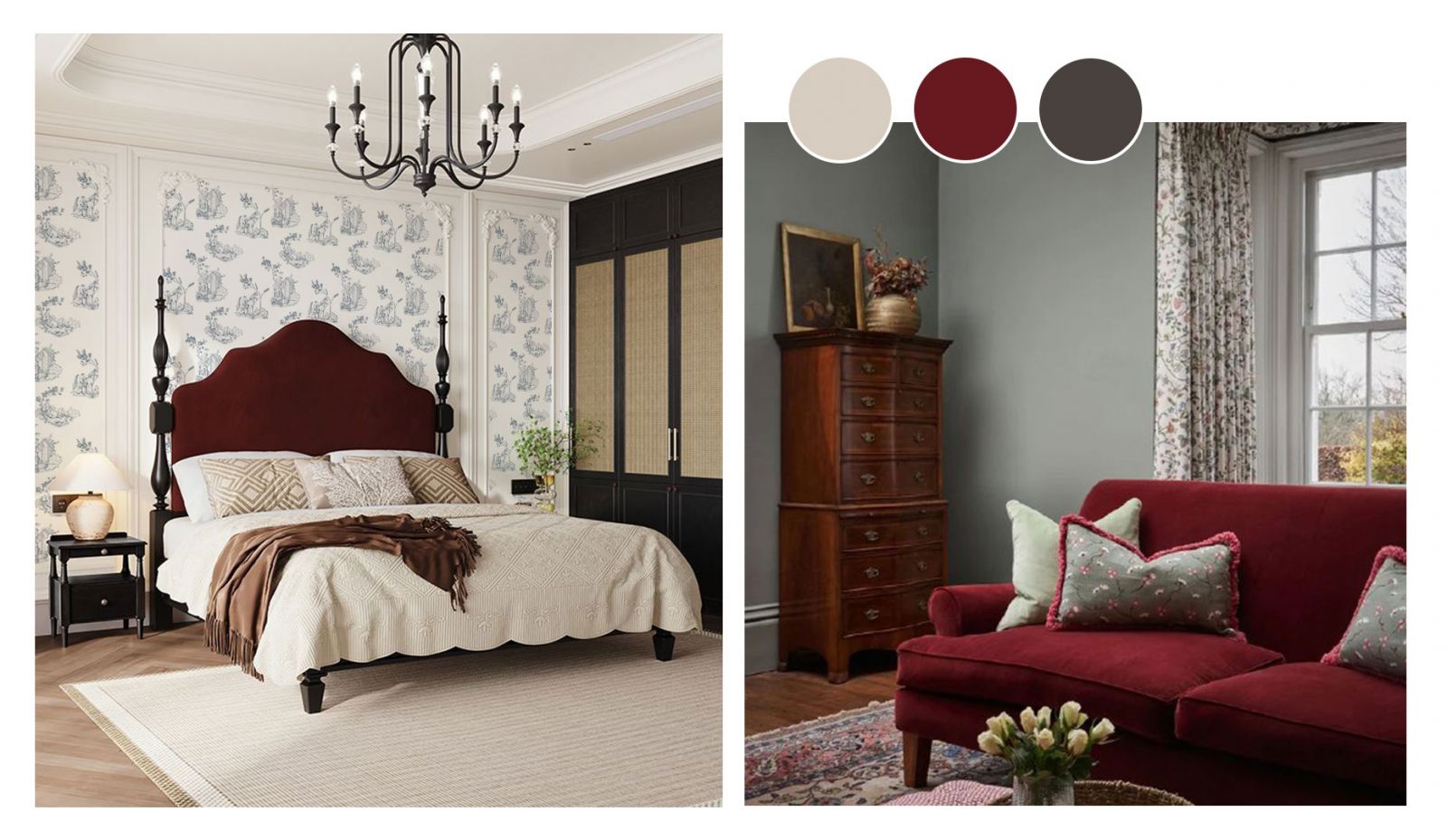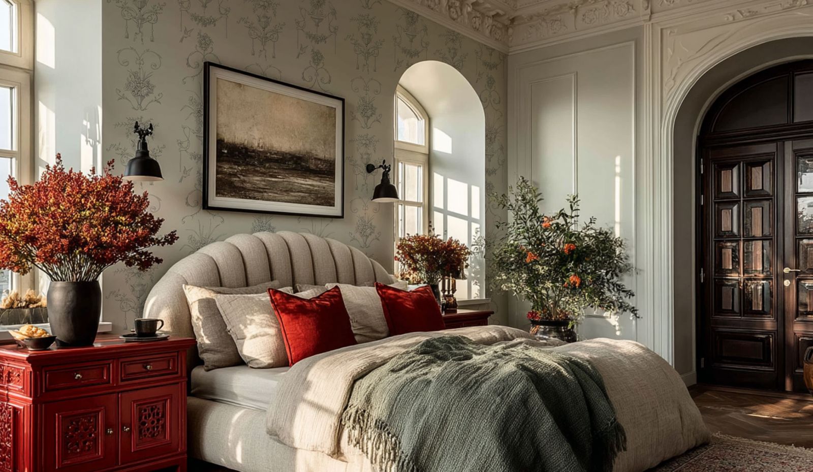- Благородные натуральные материалы и никакого пластика. Красное дерево, дуб, орех используются как в отделке пространства, так и в изготовлении мебели. В текстиле отдаётся предпочтение бархату и шёлку. Если обои, то тканевые, бумажные, экологичные альтернативы.